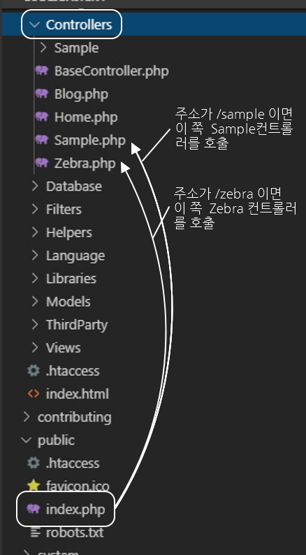 주소가 /sample 인 경우 Controllers/Sample.php 파일을 호출하고,