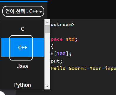 오른 쪽 상단에는 언어 선택창과 코딩을 기록하게 되어 있는데요.