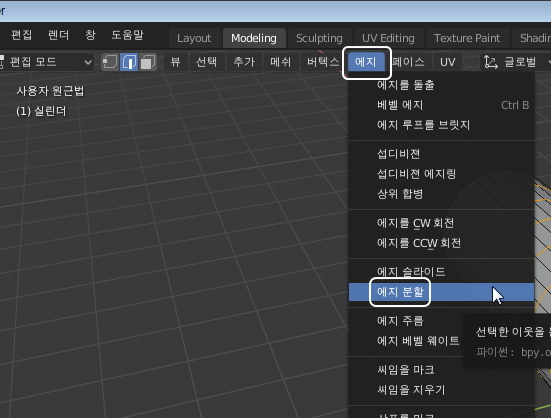 ※ 블렌더 2.83 버전에서 에지분할 메뉴가 다른 기능으로 변경되었습니다.