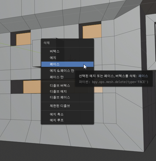 여기서 페이스를 선택하시면 면이 삭제되면서
