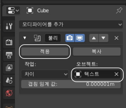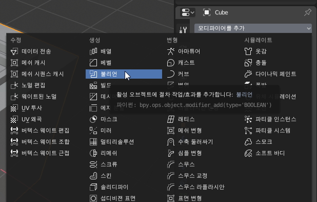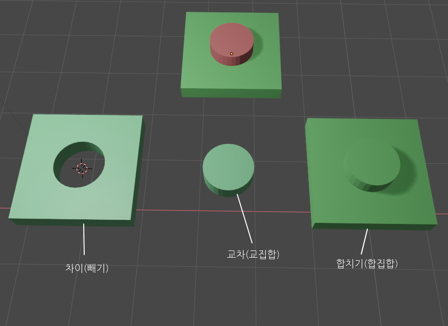 블렌더에서는 2가지의 물체를 혼합해서 빼기, 합치기. 교차 부분만 구하기 등의 도형 연산을 할 수가 있는데요.
