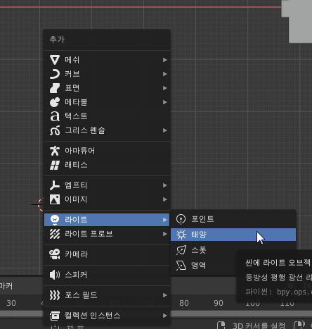 Shift + A 키를 누르고 라이트 - 태양 메뉴를 선택해주세요.