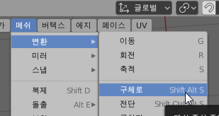 혹시 단축키가 작동이 안될 경우 메쉬 - 변환 - 구체로 메뉴를 클릭하신 다음 마우스를 움직여 주셔도 됩니다.