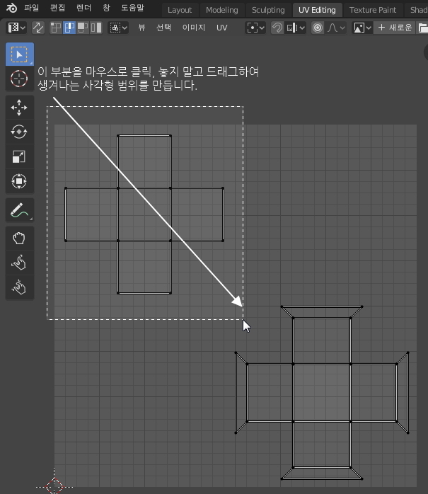 그 영역 안에 왼쪽 상단 UV 가 포함되도록 드래그해주시면 됩니다.