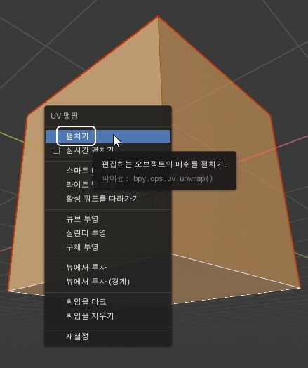 그리고 나서 다시 단축키 U 키를 눌러 UV매핑 메뉴에서 "펼치기" 메뉴를 선택해 주세요.