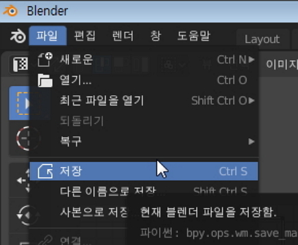 다음 시간에 이어서 할 테니 파일 - 저장 메뉴를 통해 먼저 블랜더 파일도 저장해주시고,