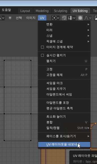 UV - UV 레이아웃을 내보내기 메뉴를 통해 작업한 UV 레이아웃을 저장하는 부분도 함께 진행해 주시기 바랍니다.