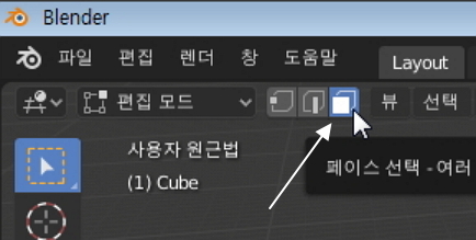 마우스를 오른쪽 창에 위치한 다음, 키보드 상단 숫자키3 을 눌러 면 편집모드로 전환한 다음에,