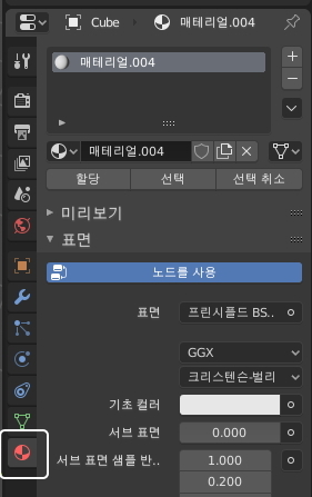 맨 우측 창에서 매트리얼 패널을 선택한 후에,