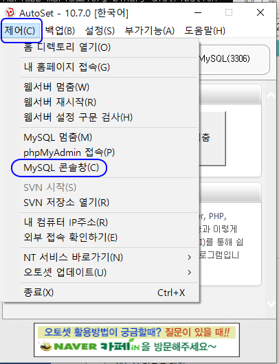 그리고 나서 제어 - MySQL 콘솔창 메뉴를 선택하시면 MYSQL 콘솔에 접속하실 수 있습니다.