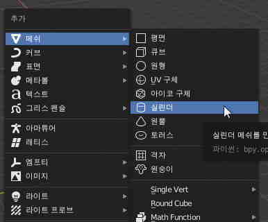 Shift + A 키를 눌러서 메쉬 - 실린더를 선택하세요.