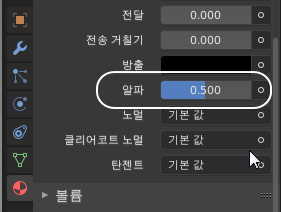 이 알파값이 바로 투명도입니다. 알파값을 0.5 정도로 바꿔 주세요.