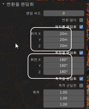 변환을 랜덤화 창을 펼쳐서 값을 조정해 주세요.