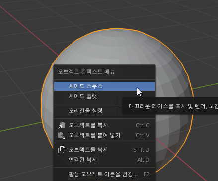 그리고 우클릭 세이드 스무스를 적용해서 표면을 부드럽게 해줍니다.