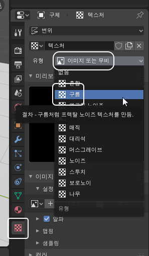 이어서 텍스쳐 아이콘 선택, 유형에서 구름을 선택합니다.