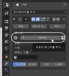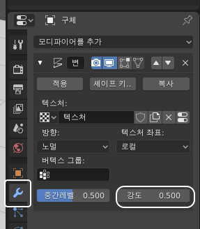 모디파이어 탭을 다시 선택한 다음, 강도를 1.0 에서 0.5 정도로 조정해주시구요.