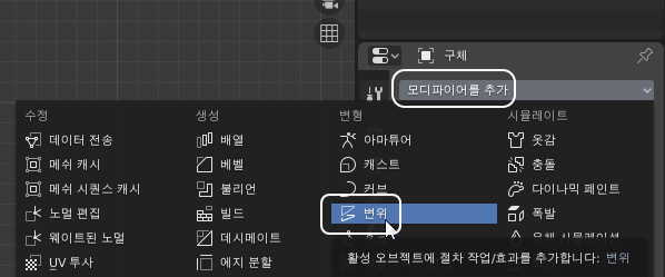 모디파이어를 추가, 변위 항목을 선택해주세요.