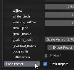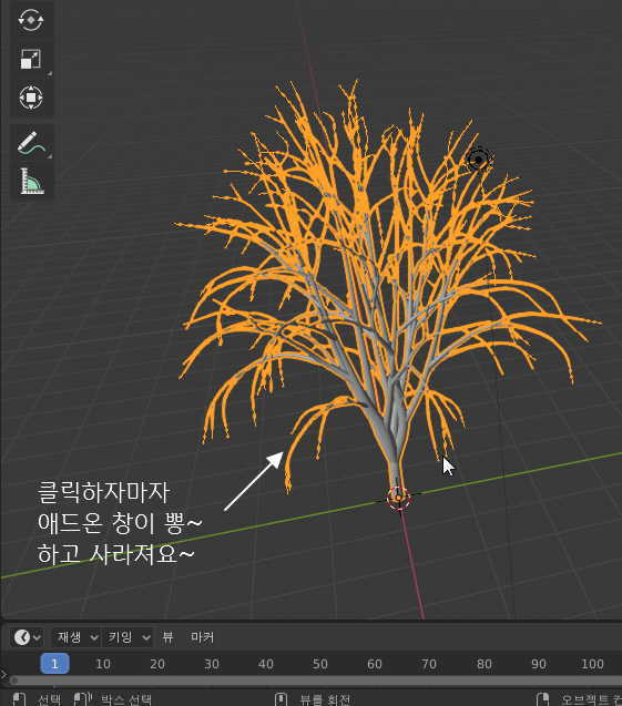 혹여나 나무 오브젝트나 다른 오브젝트를 선택하면, 애드온 창이 사라지기 때문에