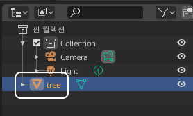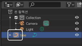 화면 우측 상단 아웃 라이너 창을 보시면 선택된 tree 오브젝트의 아이콘 모양을 보실 수 있는데요.