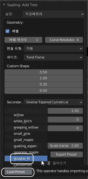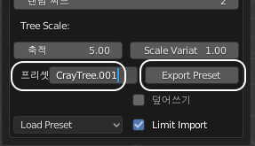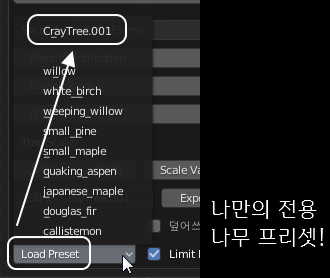 다음부터는 Load Preset 버튼을 누르면 내가 저장해놓은 나무가 함께 짜잔~하고 등장하기 때문에