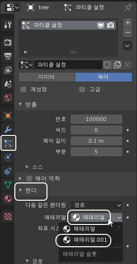 렌더 탭을 펼치신 다음에, 메테리얼 선택 항목을 메테리얼.001로 바꿔주세요.