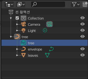 이렇게 해서 나무를 만든 다음에 아웃 라이너창에서 나무 오브젝트의 화살표를 펼쳐서