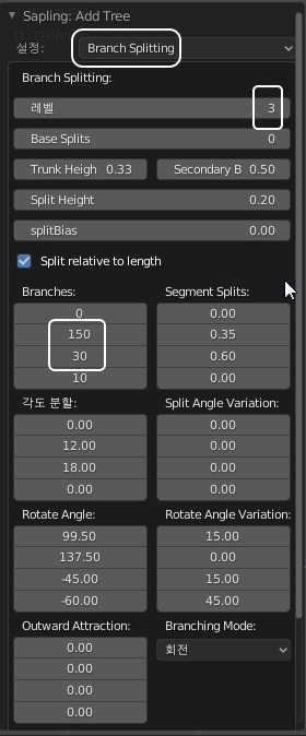 나무 애드온은 잎 속성도 설정할 수 있더군요. 참고로 나무와 잎은 매트리얼을 별개로 각각 적용할 수 있습니다.