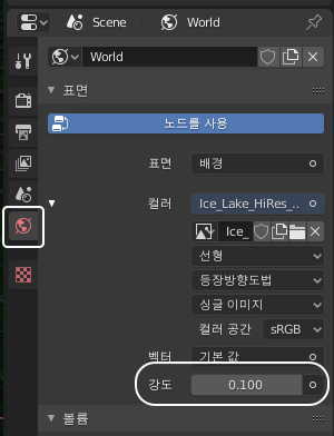월드 아이콘을 선택, 강도값을 1에서 0.1로 조정해 주세요.