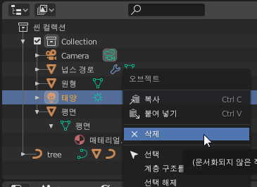 아웃 라이너 창에서 태양항목을 마우스 우클릭 - 삭제 를 선택해 주세요.