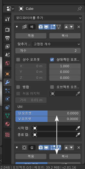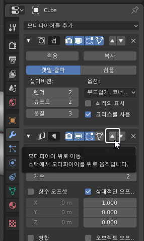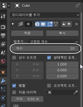 두 번쨰로는 배열 모디파이어의 병합 체크상자를 체크해주시면 됩니다.