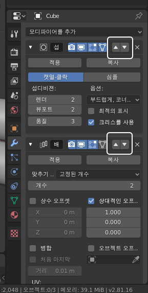 아랫쪽 배열 모디파이어의 위쪽 화살표 키를 눌러주시면