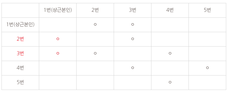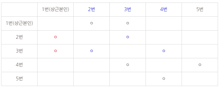 그리고 상근이의 친구의 친구는 아래와 같습니다. 빨간색으로 표시한 부분에서 오른쪽으로 찾아 나가면 되며