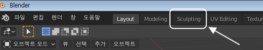 블렌더를 시작하신 다음에, 상단을 보시면 'Sculpting'이라는 탭 메뉴가 보이실 겁니다.