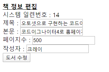 우리의다음 목표는 이 편집 페이지에서 [도서 수정] 버튼을 누르면 책 정보가 수정되는 것인데요.