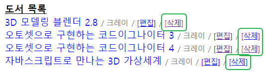 지난 편집 방식과 유사하게 책 목록 우측에 [삭제] 버튼을 추가하고,