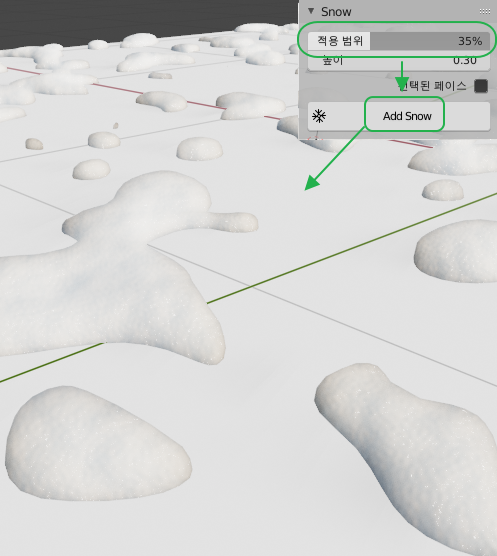 | 추가정보 참고로적용 범위를 조정하면 눈을 듬성 듬성 쌓을 수 있습니다. 눈이 녹고 있는 장면을 표현할 때 유용하시겠지요? |