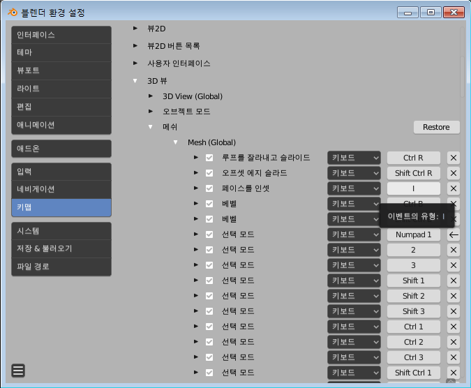 키맵 메뉴를 찾아가 3D 뷰 - 메쉬 - Mesh(Global) 탭을 펼칩니다.
