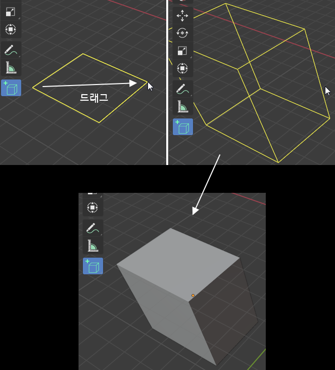 육면체의 상단면에서 또 다시 동일한 방법으로 드래그하여
