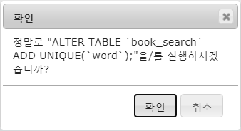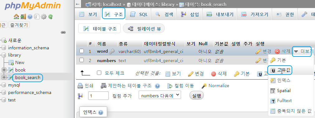 book_search 테이블 선택, '구조'를 선택하고, word 줄의 '더보기' - '고유값'을 선택하면