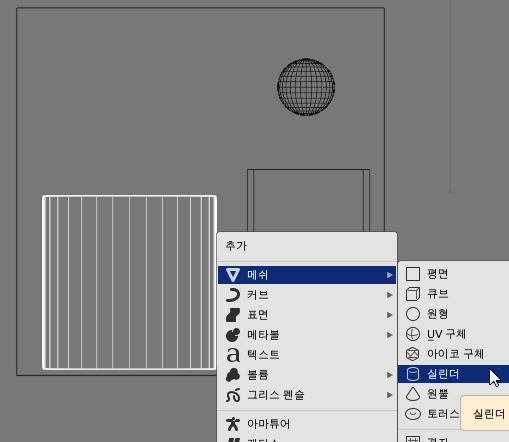 원기둥 추가 : Shift + A, 메쉬, 실린더