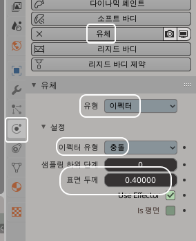 지난번과 동일합니다. 물리 아이콘 선택, 유체 클릭, 유형/이펙터, 이펙터유형/충돌, 표면 두께/0.4 를 주시면 됩니다.