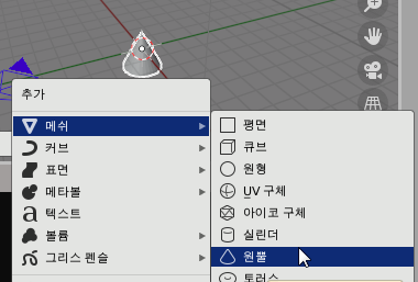 Shift + A 키를 눌러 메쉬 - 원뿔을 선택하지 않았는데도 말이지요.