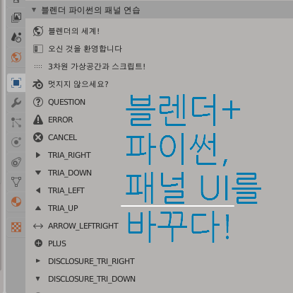 self.layout.row().label(text="블렌더의 세계!", icon='WORLD_DATA')