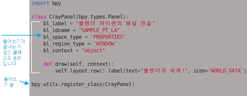 "bpy.types.Panel 부모 클래스에서 상속받아 CrayPanel 자식 클래스를 정의한다"라고 표현합니다.