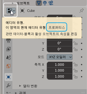참고로 블렌더 영문 UI에서는 이렇게 뜹니다. 'PROPERTIES' = 'Properties' 스펠링이 똑같지요.