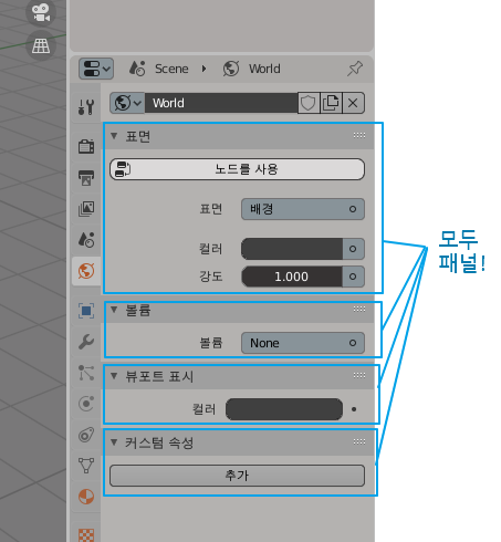 블렌더 화면의 우측 속성탭에 있는 요소들을 패널(Panel)이라고 부르는데요.