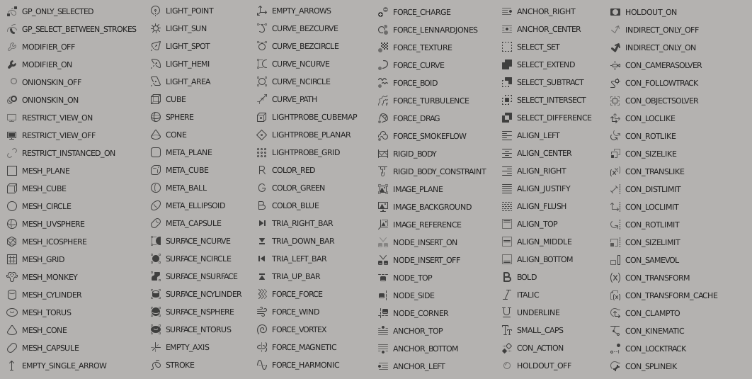 TRACKING_BACKWARDS, TRACKING_FORWARDS, TRACKING_BACKWARDS_SINGLE, TRACKING_FORWARDS_SINGLE, TRACKING_CLEAR_BACKWARDS, TRACKING_CLEAR_FORWARDS, TRACKING_REFINE_BACKWARDS, TRACKING_REFINE_FORWARDS, SCENE_DATA, RENDERLAYERS, WORLD_DATA, OBJECT_DATA, MESH_DATA, CURVE_DATA, META_DATA, LATTICE_DATA, LIGHT_DATA, MATERIAL_DATA, TEXTURE_DATA, ANIM_DATA, CAMERA_DATA, PARTICLE_DATA, LIBRARY_DATA_DIRECT, GROUP, ARMATURE_DATA, COMMUNITY, BONE_DATA, CONSTRAINT, SHAPEKEY_DATA, CONSTRAINT_BONE, CAMERA_STEREO, PACKAGE, UGLYPACKAGE, EXPERIMENTAL, BRUSH_DATA, IMAGE_DATA, FILE, FCURVE, FONT_DATA, RENDER_RESULT, SURFACE_DATA, EMPTY_DATA, PRESET, RENDER_ANIMATION, RENDER_STILL, LIBRARY_DATA_BROKEN, BOIDS, STRANDS, LIBRARY_DATA_INDIRECT, GREASEPENCIL, LINE_DATA, LIBRARY_DATA_OVERRIDE, GROUP_BONE, GROUP_VERTEX, GROUP_VCOL, GROUP_UVS, FACE_MAPS, RNA, RNA_ADD, MOUSE_LMB, MOUSE_MMB, MOUSE_RMB, MOUSE_MOVE, MOUSE_LMB_DRAG, MOUSE_MMB_DRAG, MOUSE_RMB_DRAG, MEMORY, PRESET_NEW, DECORATE, DECORATE_KEYFRAME, DECORATE_ANIMATE, DECORATE_DRIVER, DECORATE_LINKED, DECORATE_LIBRARY_OVERRIDE, DECORATE_UNLOCKED, DECORATE_LOCKED, DECORATE_OVERRIDE, FUND, TRACKER_DATA, HEART, ORPHAN_DATA, USER, SYSTEM, SETTINGS, OUTLINER_OB_EMPTY, OUTLINER_OB_MESH, OUTLINER_OB_CURVE, OUTLINER_OB_LATTICE, OUTLINER_OB_META, OUTLINER_OB_LIGHT, OUTLINER_OB_CAMERA, OUTLINER_OB_ARMATURE, OUTLINER_OB_FONT, OUTLINER_OB_SURFACE, OUTLINER_OB_SPEAKER, OUTLINER_OB_FORCE_FIELD, OUTLINER_OB_GROUP_INSTANCE, OUTLINER_OB_GREASEPENCIL, OUTLINER_OB_LIGHTPROBE, OUTLINER_OB_IMAGE, RESTRICT_COLOR_OFF, RESTRICT_COLOR_ON, HIDE_ON, HIDE_OFF, RESTRICT_SELECT_ON, RESTRICT_SELECT_OFF, RESTRICT_RENDER_ON, RESTRICT_RENDER_OFF, RESTRICT_INSTANCED_OFF, OUTLINER_DATA_EMPTY, OUTLINER_DATA_MESH, OUTLINER_DATA_CURVE, OUTLINER_DATA_LATTICE, OUTLINER_DATA_META, OUTLINER_DATA_LIGHT, OUTLINER_DATA_CAMERA, OUTLINER_DATA_ARMATURE, OUTLINER_DATA_FONT, OUTLINER_DATA_SURFACE, OUTLINER_DATA_SPEAKER, OUTLINER_DATA_LIGHTPROBE, OUTLINER_DATA_GP_LAYER, OUTLINER_DATA_GREASEPENCIL, GP_SELECT_POINTS, GP_SELECT_STROKES, GP_MULTIFRAME_EDITING