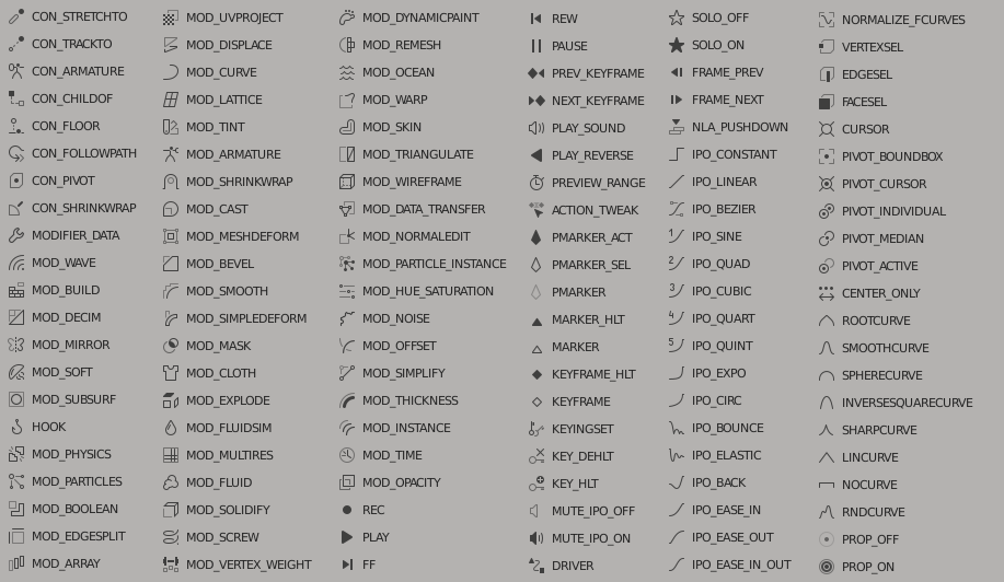 CON_STRETCHTO, CON_TRACKTO, CON_ARMATURE, CON_CHILDOF, CON_FLOOR, CON_FOLLOWPATH, CON_PIVOT, CON_SHRINKWRAP, MODIFIER_DATA, MOD_WAVE, MOD_BUILD, MOD_DECIM, MOD_MIRROR, MOD_SOFT, MOD_SUBSURF, HOOK, MOD_PHYSICS, MOD_PARTICLES, MOD_BOOLEAN, MOD_EDGESPLIT, MOD_ARRAY, MOD_UVPROJECT, MOD_DISPLACE, MOD_CURVE, MOD_LATTICE, MOD_TINT, MOD_ARMATURE, MOD_SHRINKWRAP, MOD_CAST, MOD_MESHDEFORM, MOD_BEVEL, MOD_SMOOTH, MOD_SIMPLEDEFORM, MOD_MASK, MOD_CLOTH, MOD_EXPLODE, MOD_FLUIDSIM, MOD_MULTIRES, MOD_FLUID, MOD_SOLIDIFY, MOD_SCREW, MOD_VERTEX_WEIGHT, MOD_DYNAMICPAINT, MOD_REMESH, MOD_OCEAN, MOD_WARP, MOD_SKIN, MOD_TRIANGULATE, MOD_WIREFRAME, MOD_DATA_TRANSFER, MOD_NORMALEDIT, MOD_PARTICLE_INSTANCE, MOD_HUE_SATURATION, MOD_NOISE, MOD_OFFSET, MOD_SIMPLIFY, MOD_THICKNESS, MOD_INSTANCE, MOD_TIME, MOD_OPACITY, REC, PLAY, FF, REW, PAUSE, PREV_KEYFRAME, NEXT_KEYFRAME, PLAY_SOUND, PLAY_REVERSE, PREVIEW_RANGE, ACTION_TWEAK, PMARKER_ACT, PMARKER_SEL, PMARKER, MARKER_HLT, MARKER, KEYFRAME_HLT, KEYFRAME, KEYINGSET, KEY_DEHLT, KEY_HLT, MUTE_IPO_OFF, MUTE_IPO_ON, DRIVER, SOLO_OFF, SOLO_ON, FRAME_PREV, FRAME_NEXT, NLA_PUSHDOWN, IPO_CONSTANT, IPO_LINEAR, IPO_BEZIER, IPO_SINE, IPO_QUAD, IPO_CUBIC, IPO_QUART, IPO_QUINT, IPO_EXPO, IPO_CIRC, IPO_BOUNCE, IPO_ELASTIC, IPO_BACK, IPO_EASE_IN, IPO_EASE_OUT, IPO_EASE_IN_OUT, NORMALIZE_FCURVES, VERTEXSEL, EDGESEL, FACESEL, CURSOR, PIVOT_BOUNDBOX, PIVOT_CURSOR, PIVOT_INDIVIDUAL, PIVOT_MEDIAN, PIVOT_ACTIVE, CENTER_ONLY, ROOTCURVE, SMOOTHCURVE, SPHERECURVE, INVERSESQUARECURVE, SHARPCURVE, LINCURVE, NOCURVE, RNDCURVE, PROP_OFF, PROP_ON