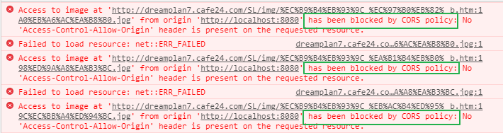 교차출처 리소스 공유 정책 : 요청된 리소스의 '접근제어허가기준'에 대한 헤더가 현재 없습니다. 라는 의미인데요.