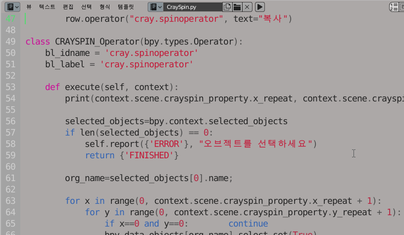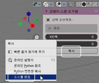최근 애드온 기능으로 추가한 크레이의 스핀 도구창을 열고 [복사 버튼]을 마우스 우클릭하시면